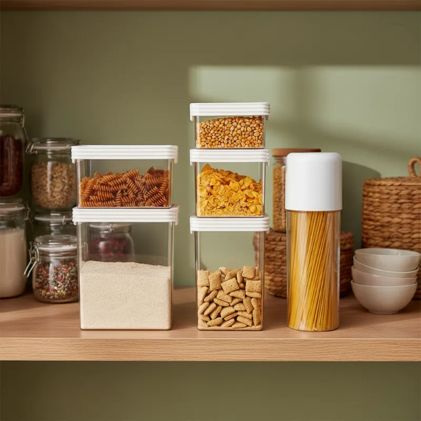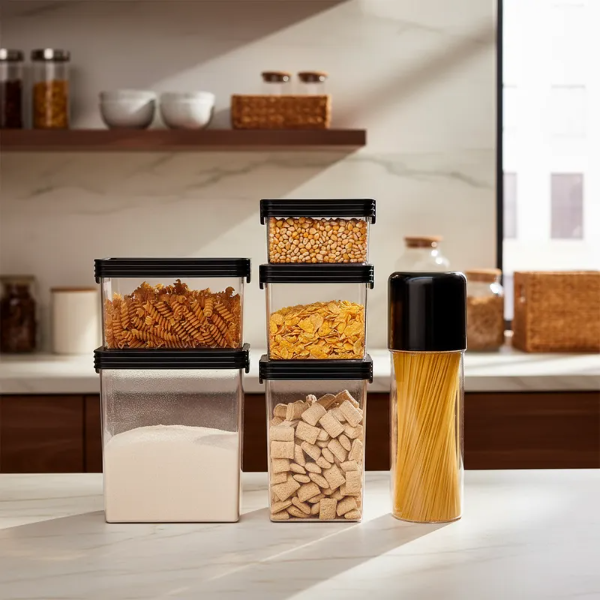Sistema de almacenamiento en seco hermético, envase acrílico y tapa con sello de silicona, apilable. Fácil apertura, se deslizan las trabas de costado hacia arriba y hacia abajo para un sello hermético. Ideal para alimentos secos, conserve por mas tiempo y sin perdida de sabor los alimentos.