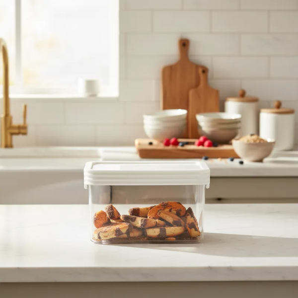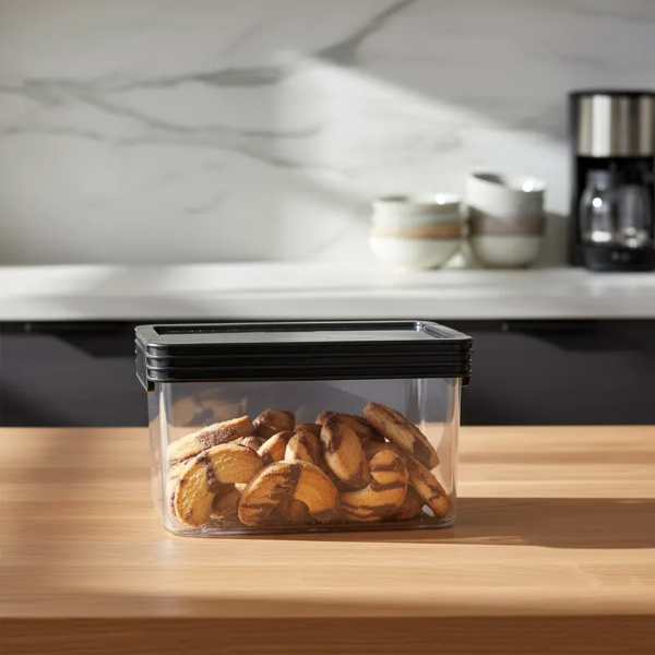 Sistema de almacenamiento en seco hermético, envase acrílico y tapa con sello de silicona, apilable. Fácil apertura, se deslizan las trabas de costado hacia arriba y hacia abajo para un sello hermético. Ideal para alimentos secos, conserve por mas tiempo y sin perdida de sabor los alimentos.