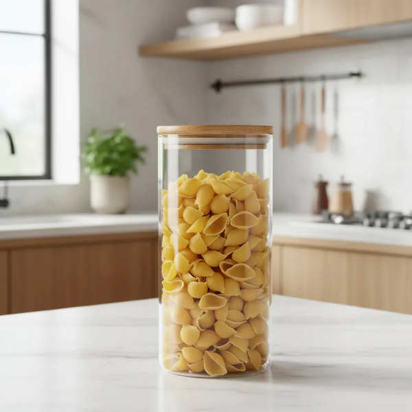 Fabricado en vidrio de alta calidad y con una tapa de bamboo hermética, garantiza la conservación de tus productos en un ambiente protegido. Su material es resistente, asegurando durabilidad y funcionalidad en tu cocina.